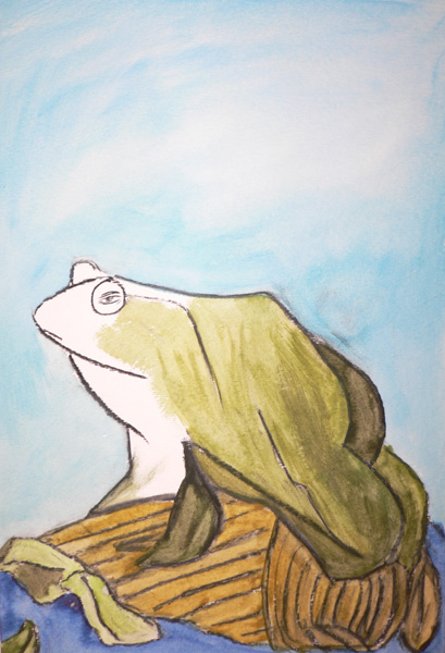 frog with log and blue sky